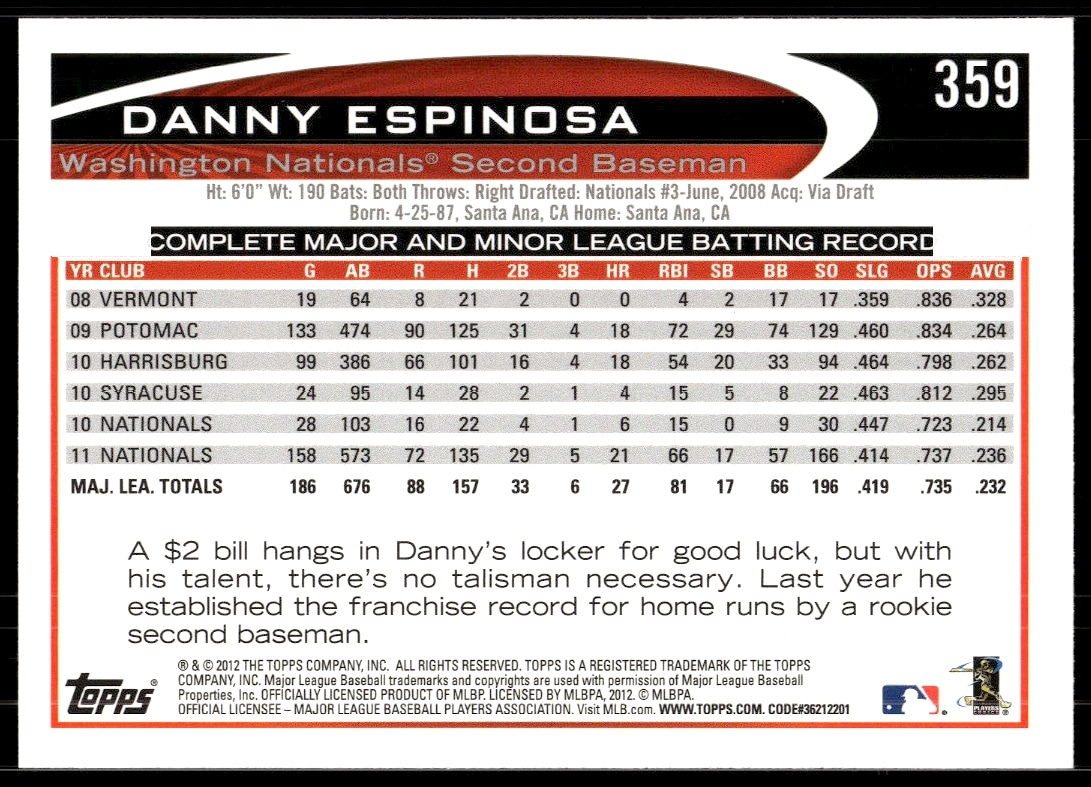 This Baseball card, from 2012 is part of the Topps card set. Danny Espinosa is featured and has a card number of 359.