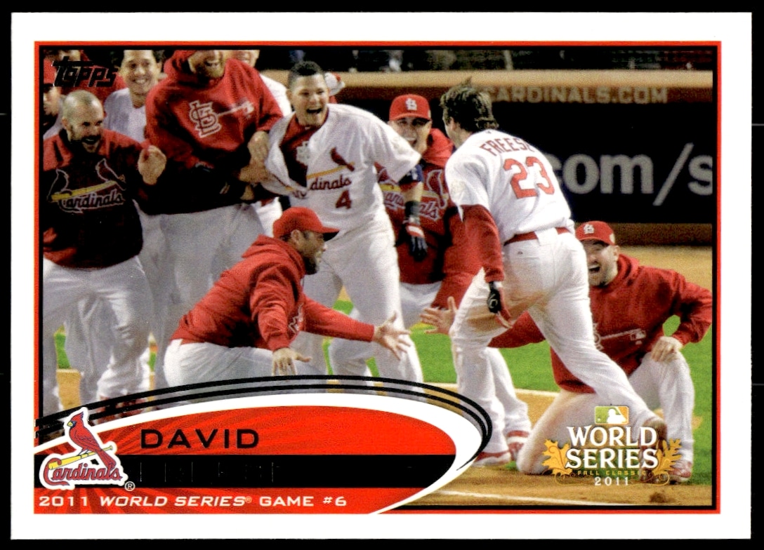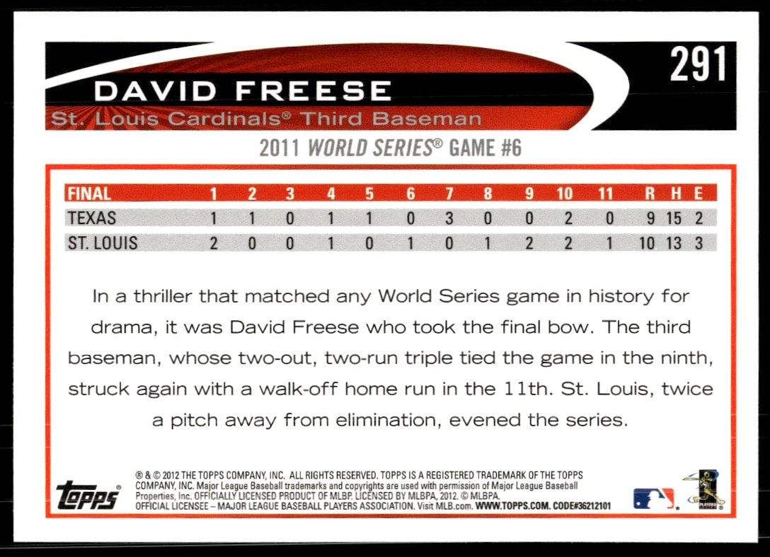 This Baseball card, from 2012 is part of the Topps card set. David Freese is featured and has a card number of 291.