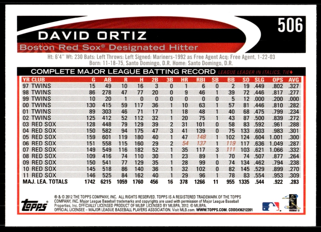 This Baseball card, from 2012 is part of the Topps card set. David Ortiz is featured and has a card number of 506.
