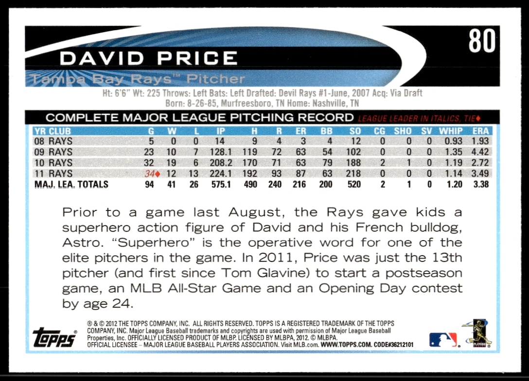 This Baseball card, from 2012 is part of the Topps card set. David Price is featured and has a card number of 80.