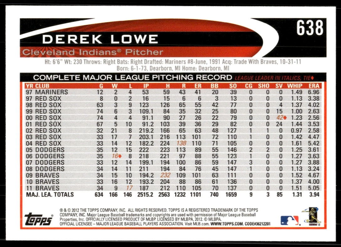 This Baseball card, from 2012 is part of the Topps card set. Derek Lowe is featured and has a card number of 638.