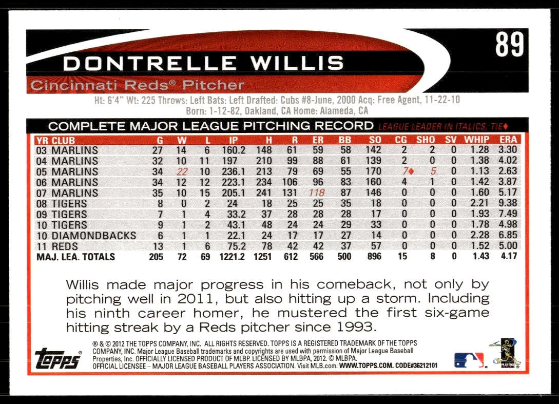 This Baseball card, from 2012 is part of the Topps card set. Dontrelle Willis is featured and has a card number of 89.