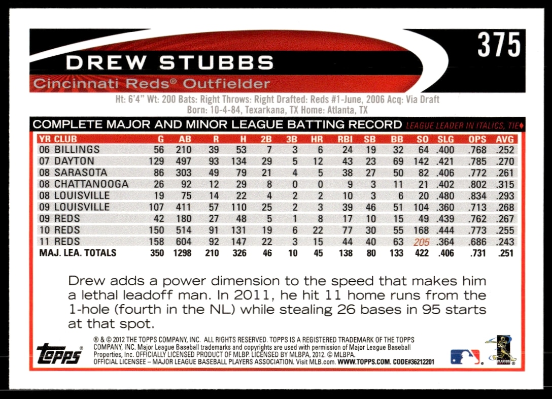 This Baseball card, from 2012 is part of the Topps card set. Drew Stubbs is featured and has a card number of 375.