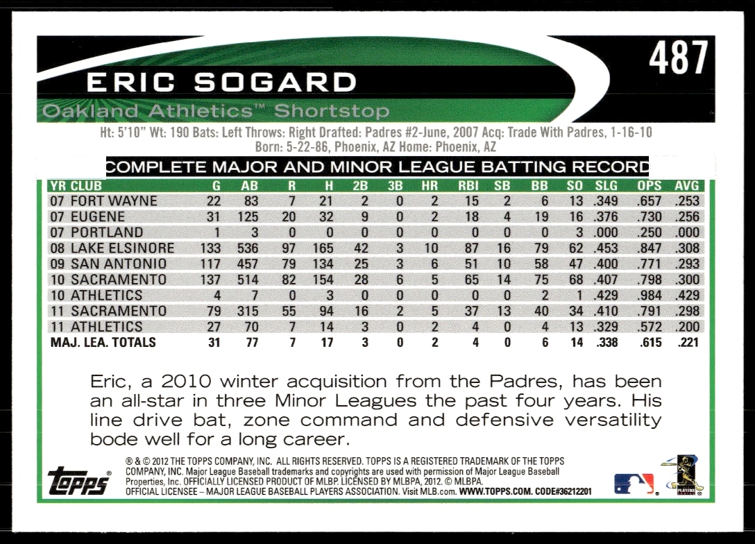 This Baseball card, from 2012 is part of the Topps card set. Eric Sogard is featured and has a card number of 487.