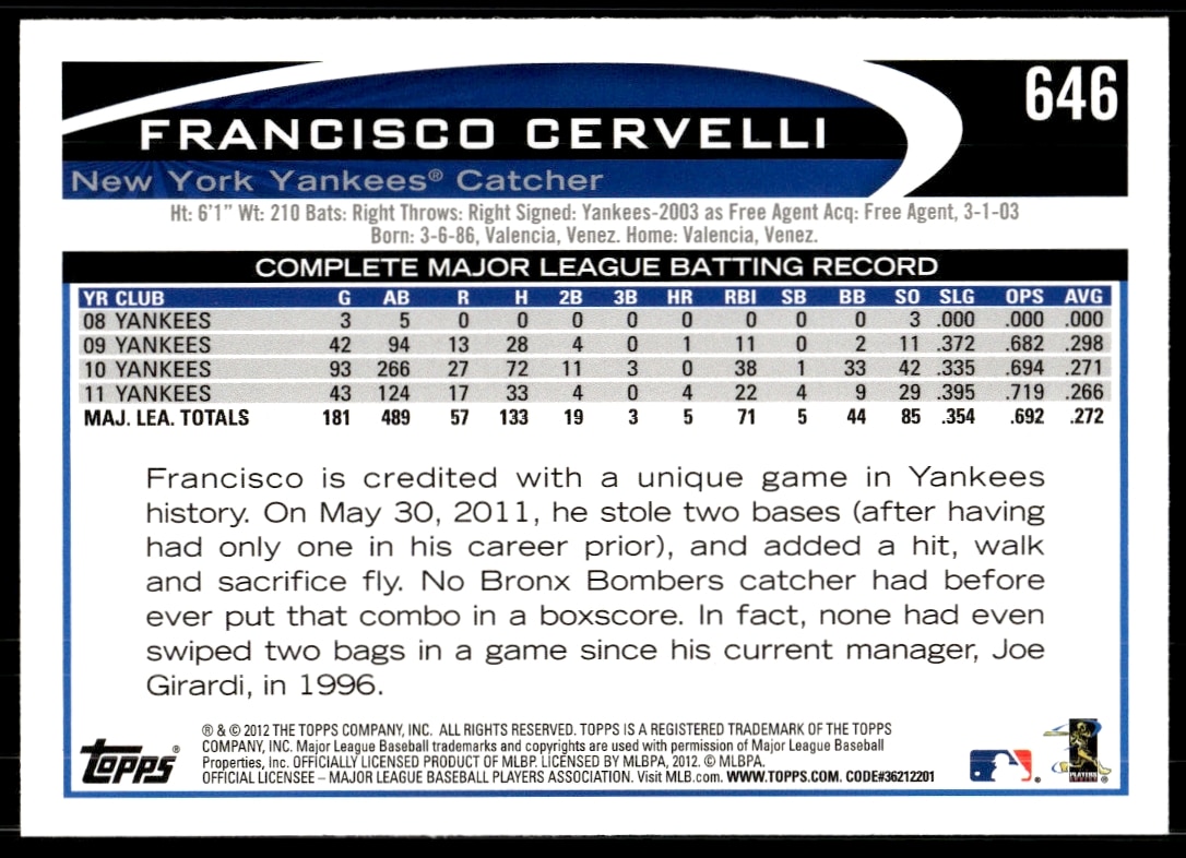 This Baseball card, from 2012 is part of the Topps card set. Francisco Cervelli is featured and has a card number of 646.