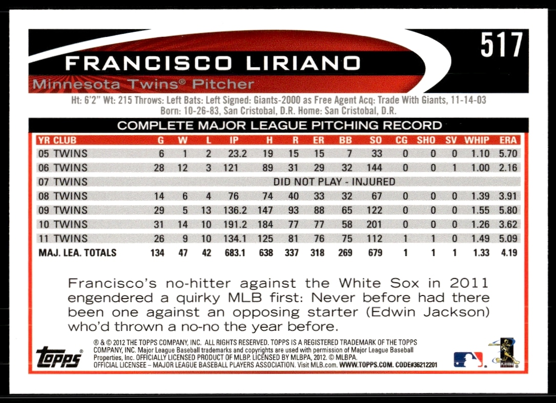 This Baseball card, from 2012 is part of the Topps card set. Francisco Liriano is featured and has a card number of 517.