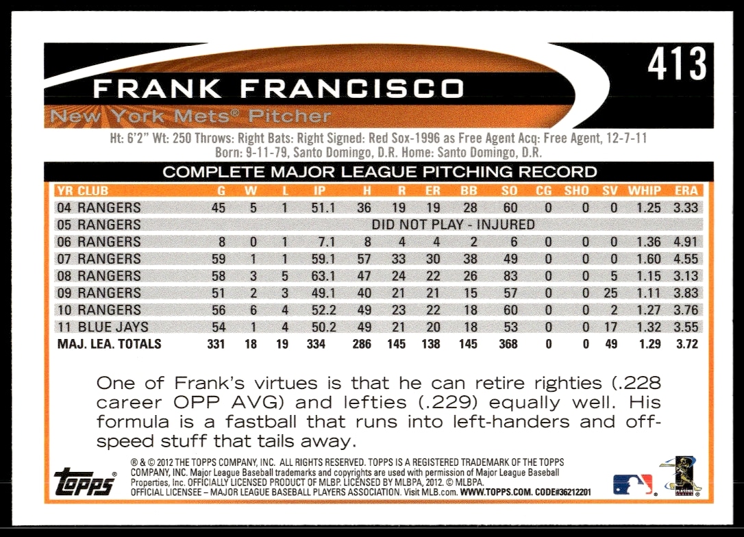 This Baseball card, from 2012 is part of the Topps card set. Frank Francisco is featured and has a card number of 413.