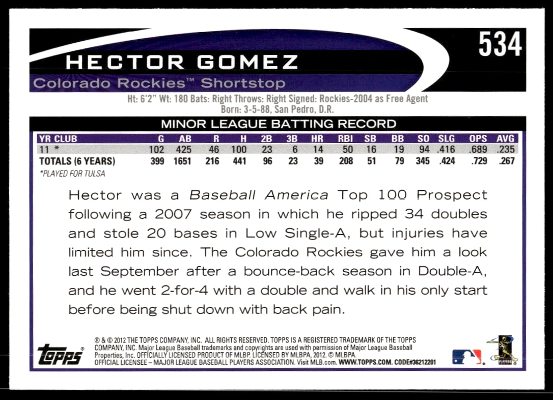 This Baseball card, from 2012 is part of the Topps card set. Hector Gomez is featured and has a card number of 534.