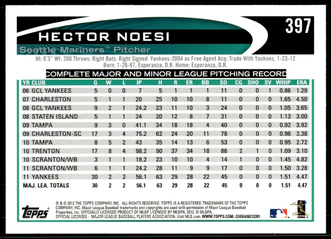 This Baseball card, from 2012 is part of the Topps card set. Hector Noesi is featured and has a card number of 397.