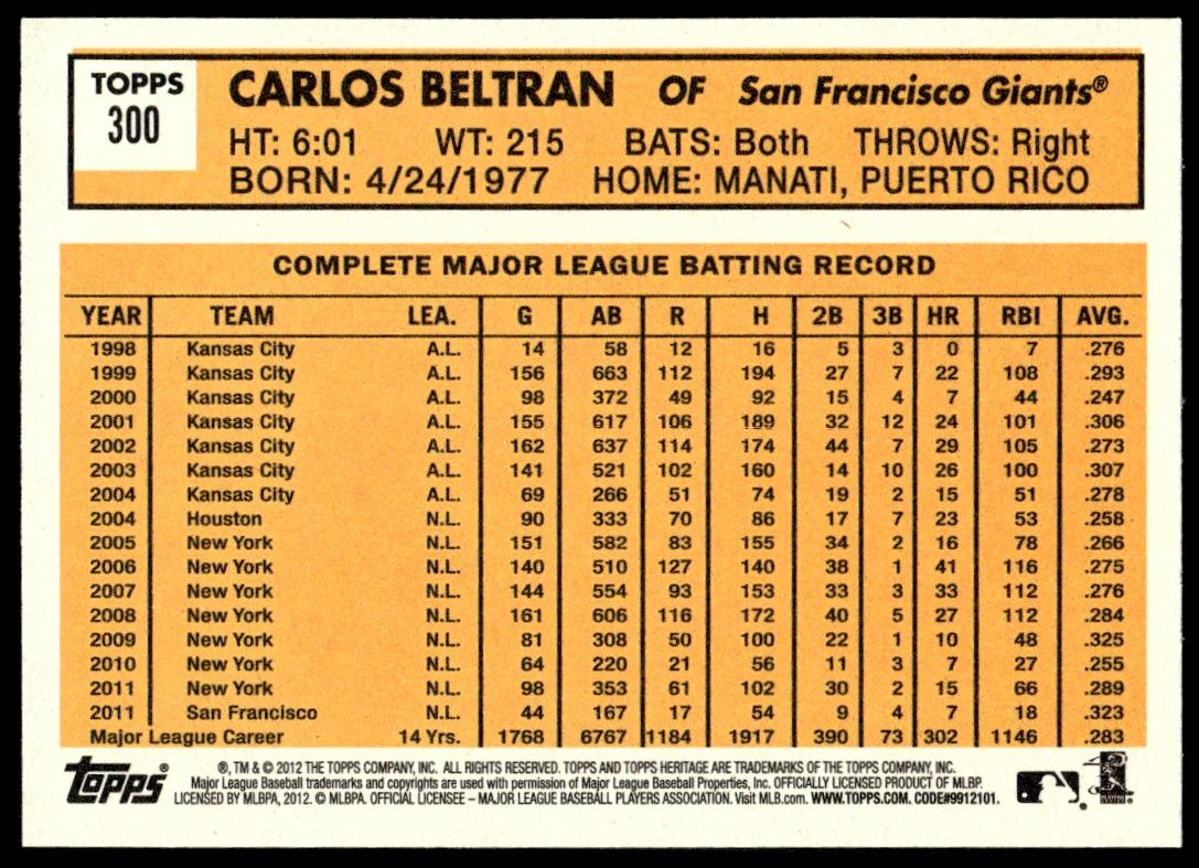This Baseball card, from 2012 is part of the Topps Heritage card set. Carlos Beltran is featured and has a card number of 300.