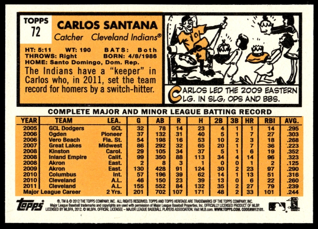 This Baseball card, from 2012 is part of the Topps Heritage card set. Carlos Santana is featured and has a card number of 72.