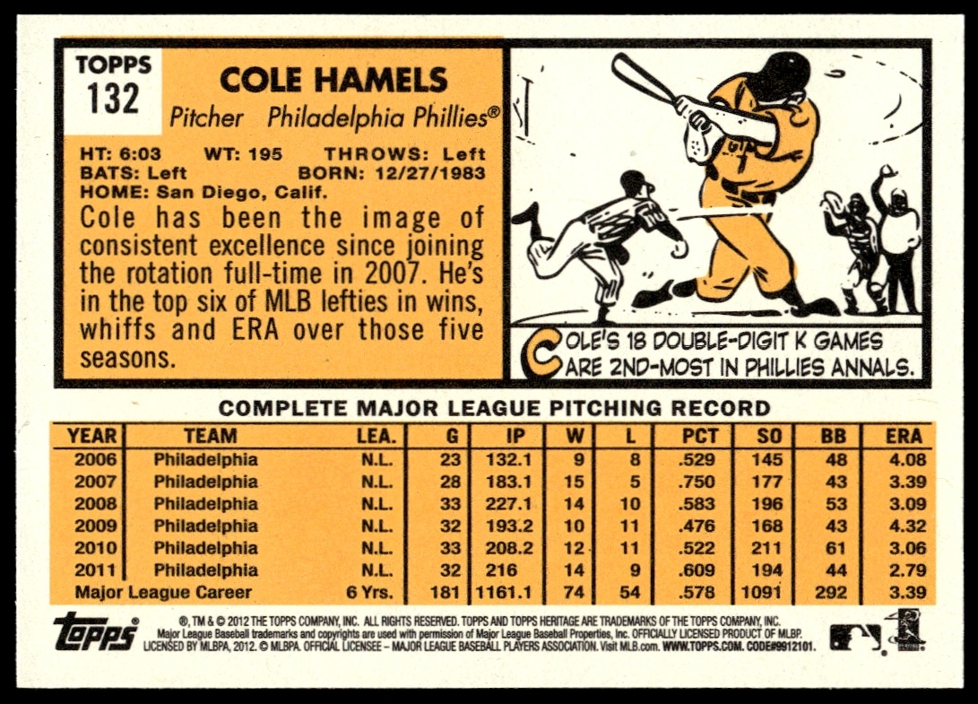 This Baseball card, from 2012 is part of the Topps Heritage card set. Cole Hamels is featured and has a card number of 132.