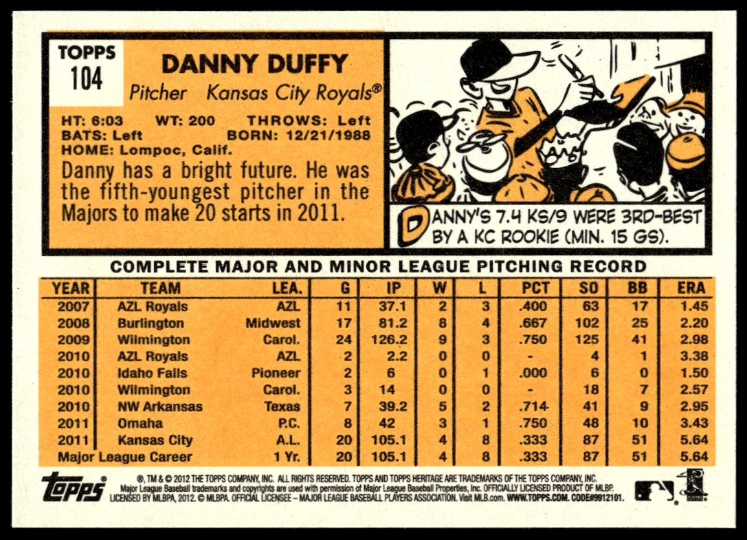This BaseballΒ card, from 2012 is part of the Topps HeritageΒ card set. Danny Duffy is featured and has a card number of 104.