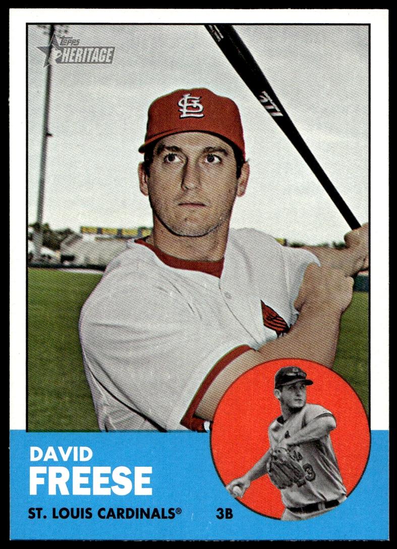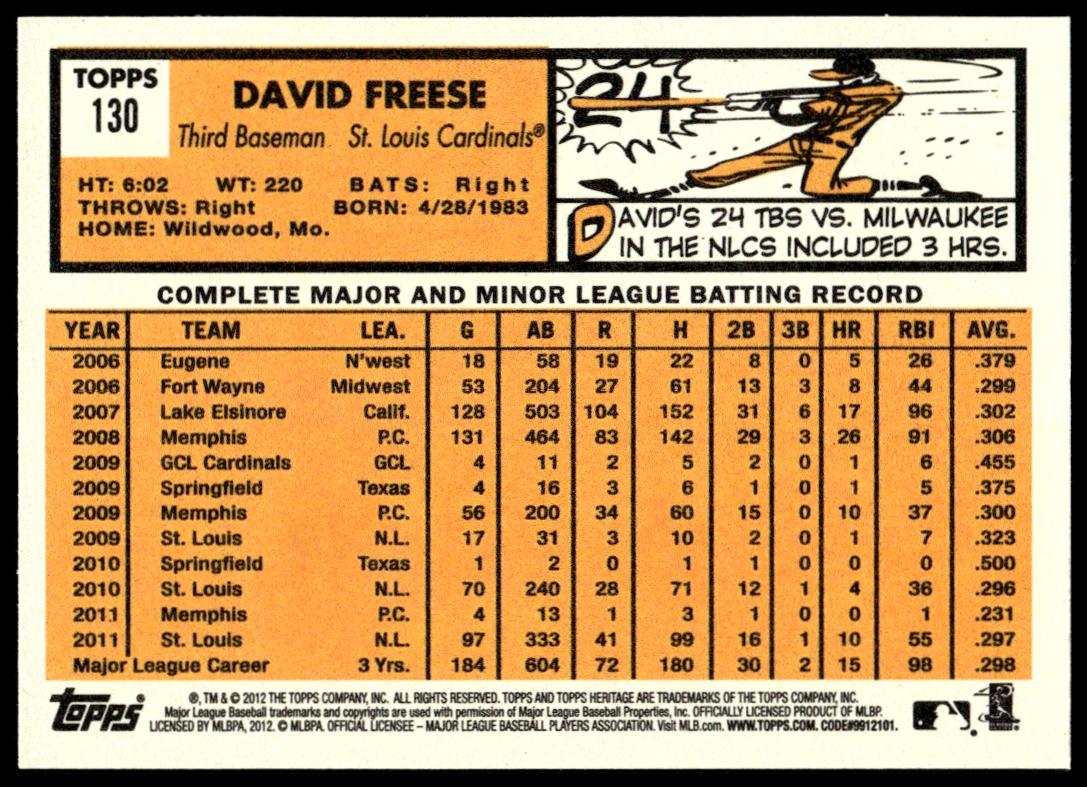 This Baseball card, from 2012 is part of the Topps Heritage card set. David Freese is featured and has a card number of 130.