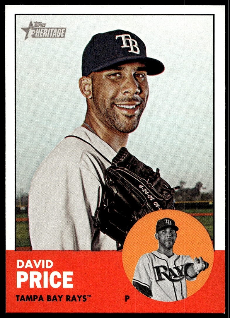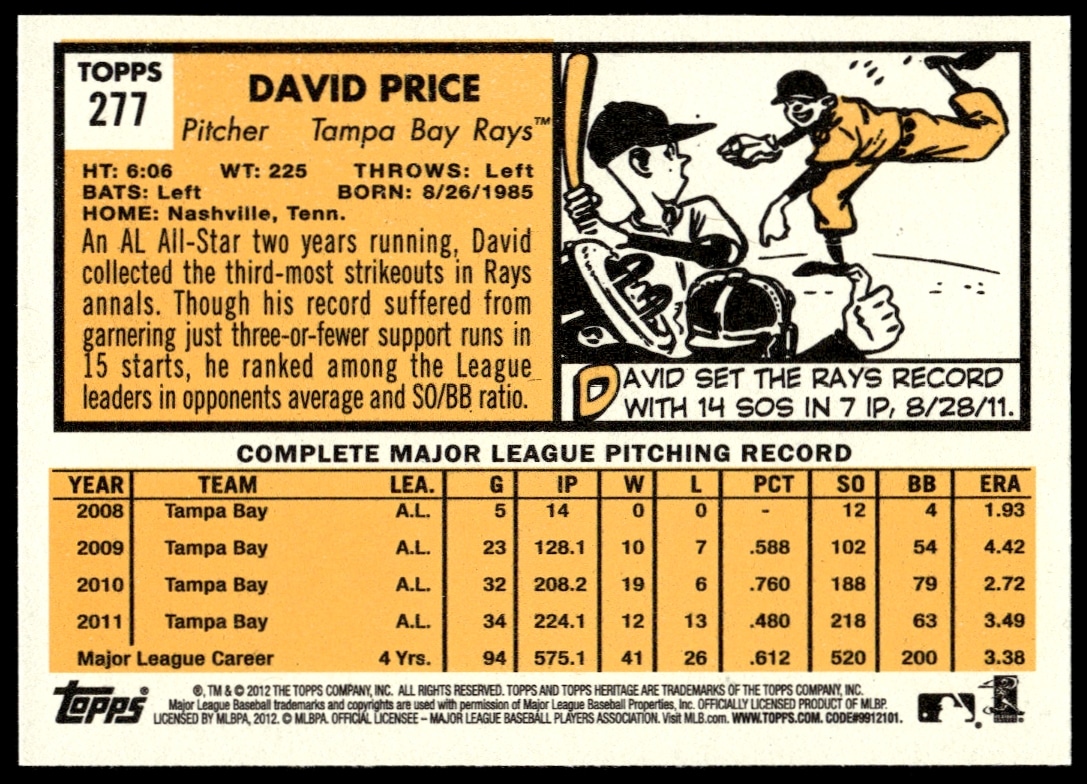 This Baseball card, from 2012 is part of the Topps Heritage card set. David Price is featured and has a card number of 277.