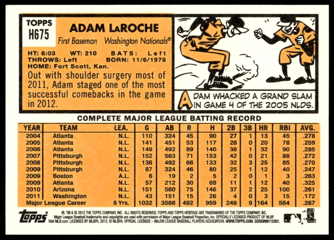 This Baseball card, from 2012 is part of the Topps Heritage High Number card set. Adam LaRoche is featured and has a card number of H675.