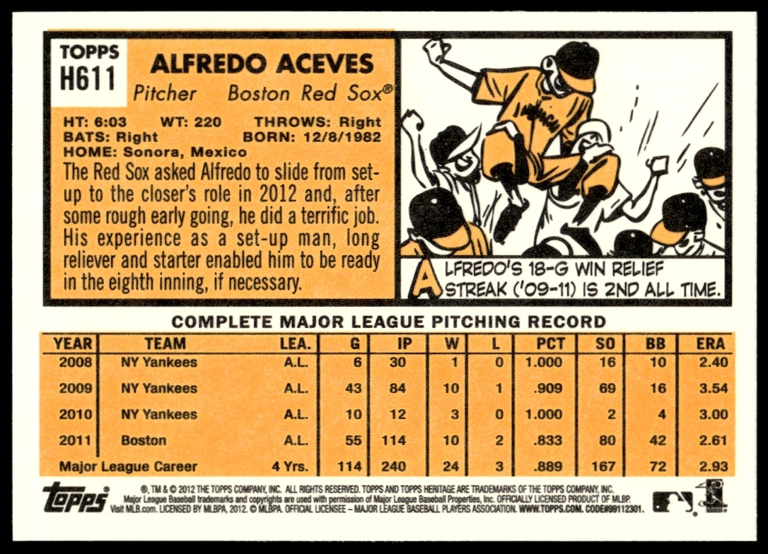 This BaseballΒ card, from 2012 is part of the Topps Heritage High NumberΒ card set. Alfredo Aceves is featured and has a card number of H611.