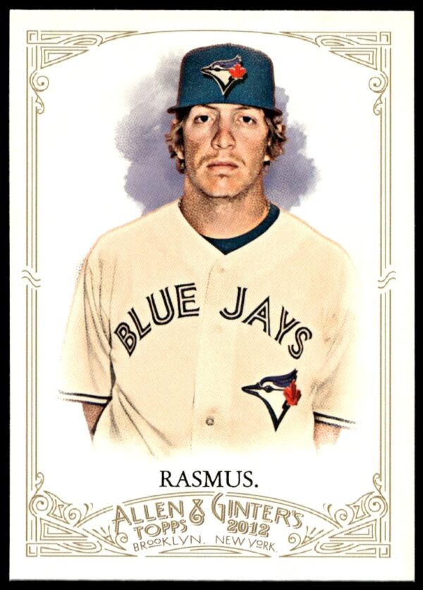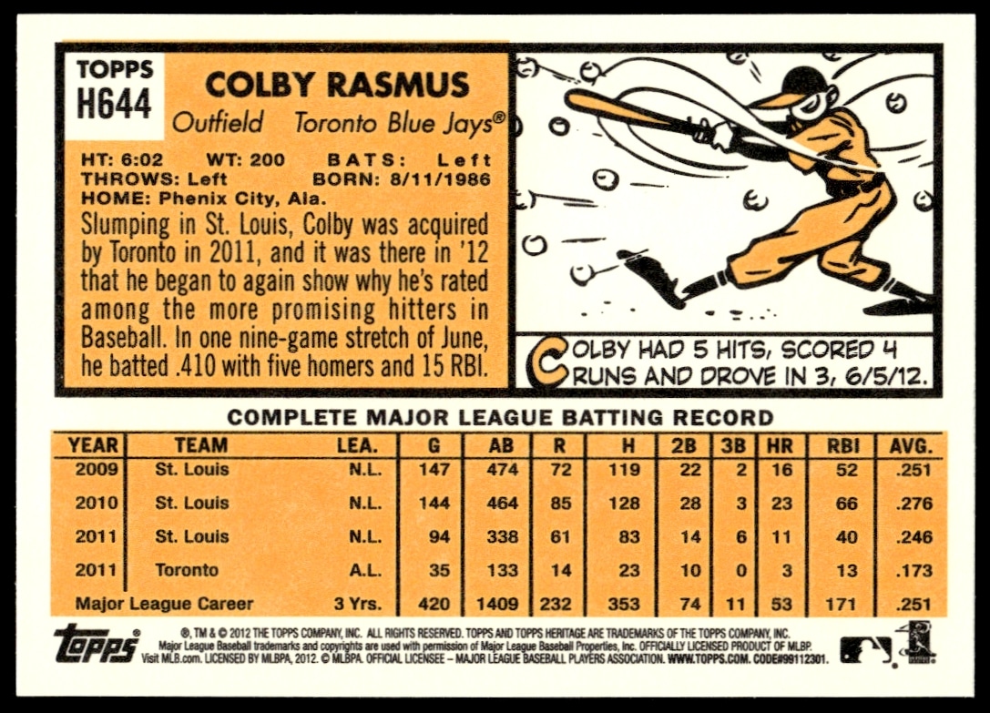 This BaseballΒ card, from 2012 is part of the Topps Heritage High NumberΒ card set. Colby Rasmus is featured and has a card number of H644.