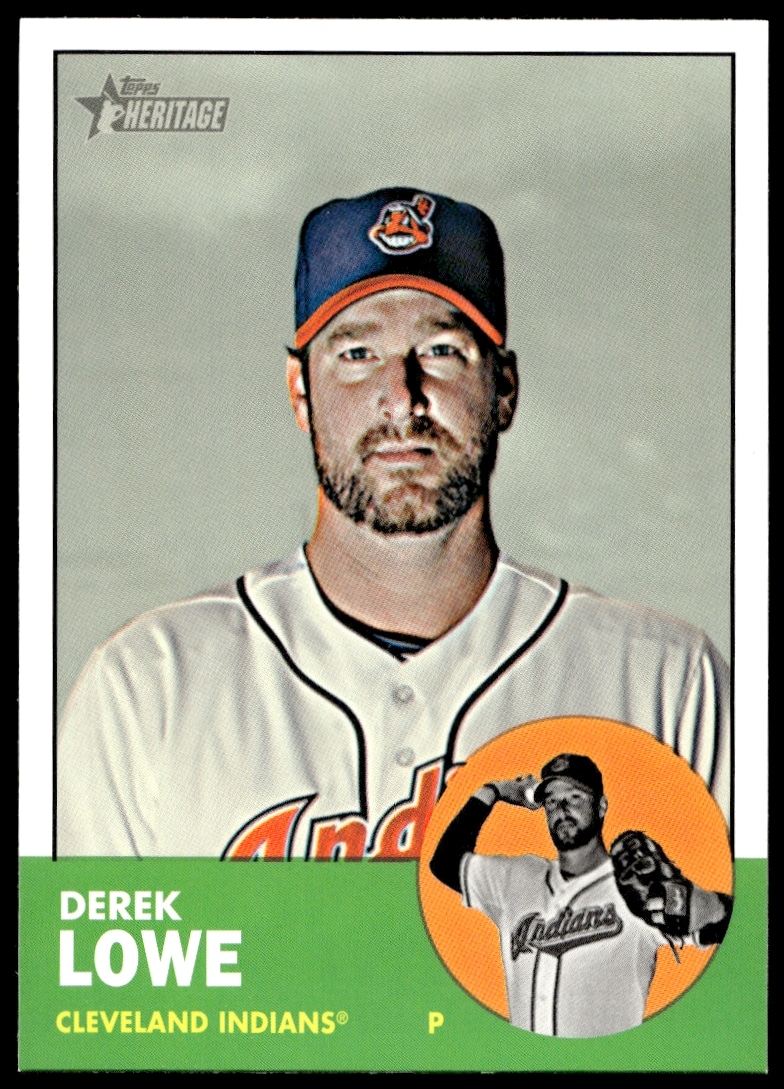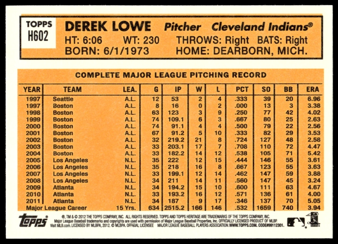 This BaseballΒ card, from 2012 is part of the Topps Heritage High NumberΒ card set. Derek Lowe is featured and has a card number of H602.