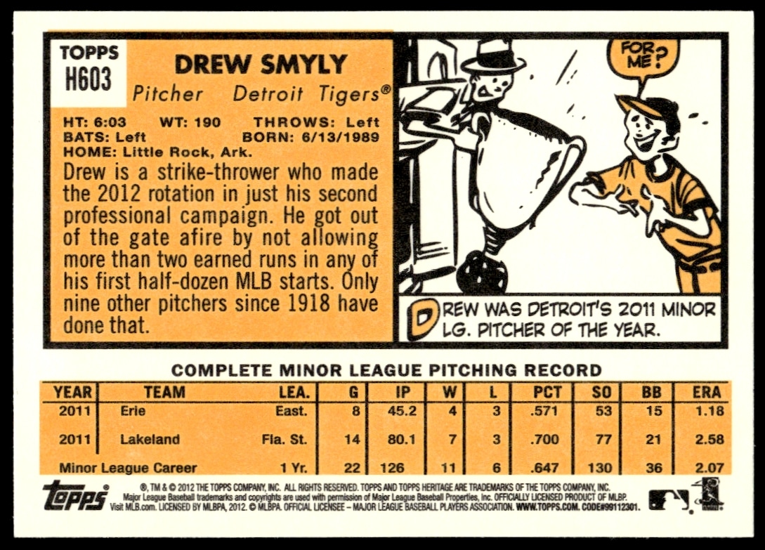This BaseballΒ card, from 2012 is part of the Topps Heritage High NumberΒ card set. Drew Smyly is featured and has a card number of H603.