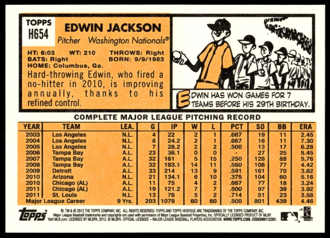 This BaseballΒ card, from 2012 is part of the Topps Heritage High NumberΒ card set. Edwin Jackson is featured and has a card number of H654.