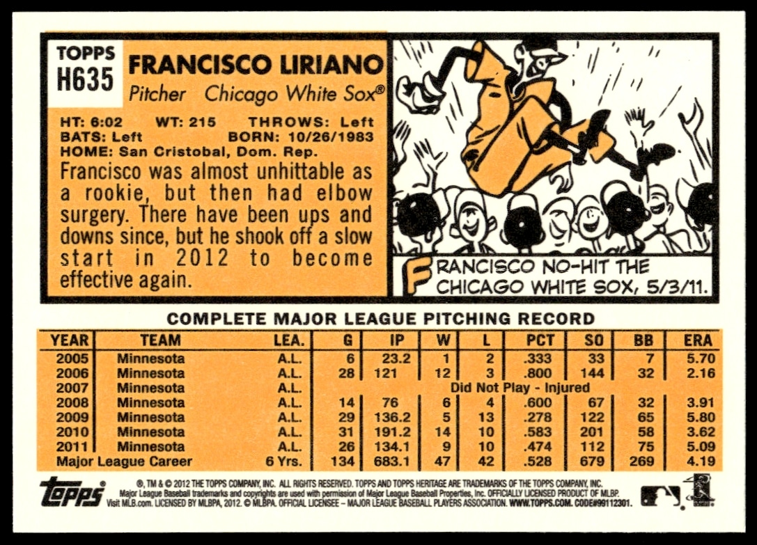 This Baseball card, from 2012 is part of the Topps Heritage High Number card set. Francisco Liriano is featured and has a card number of H635.