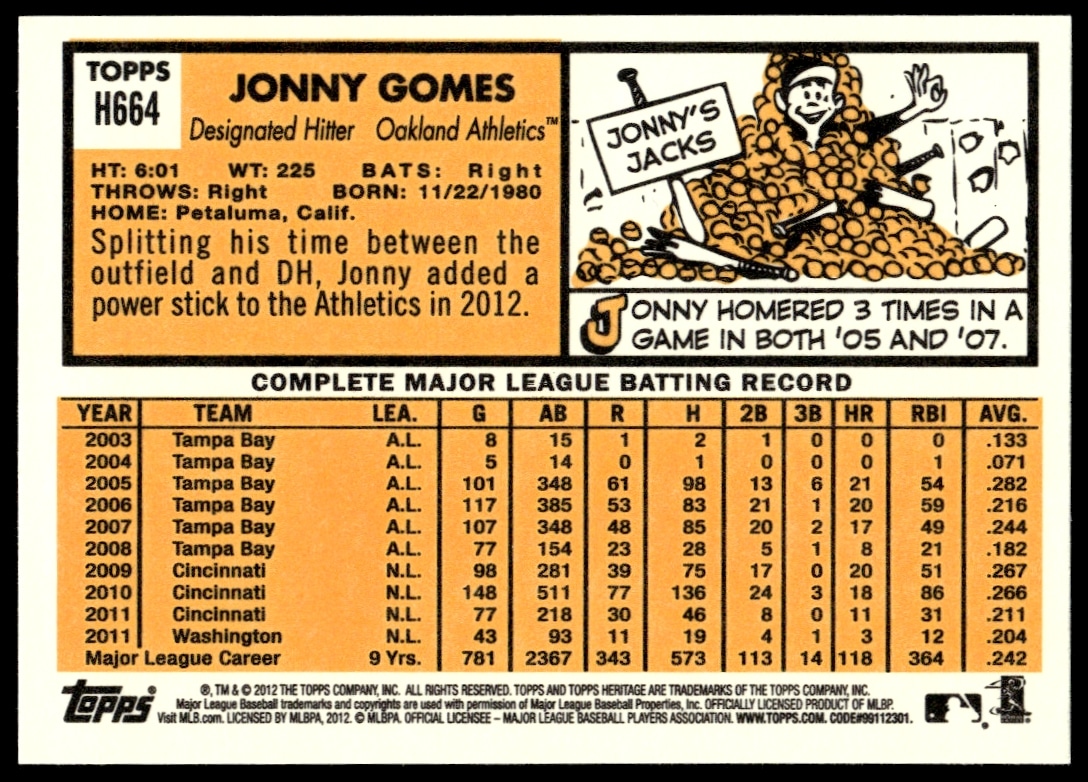 This BaseballΒ card, from 2012 is part of the Topps Heritage High NumberΒ card set. Jonny Gomes is featured and has a card number of H664.