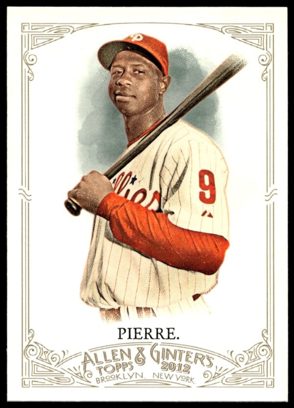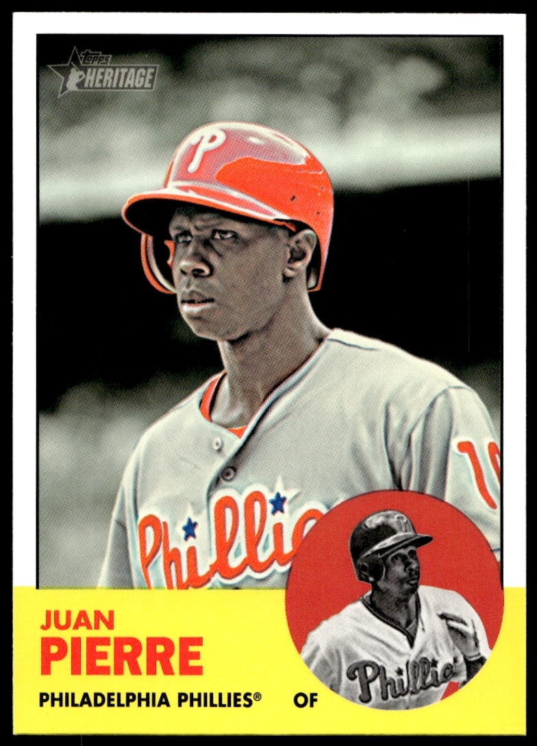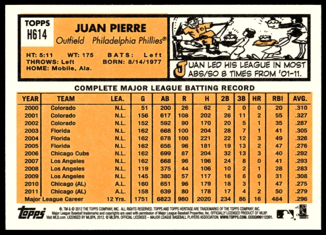 This BaseballΒ card, from 2012 is part of the Topps Heritage High NumberΒ card set. Juan Pierre is featured and has a card number of H614.