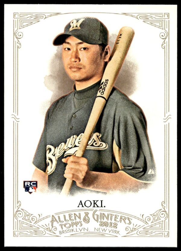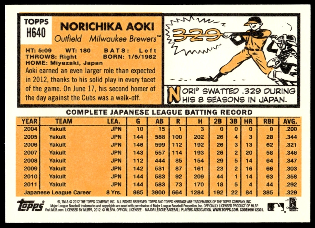 This BaseballΒ card, from 2012 is part of the Topps Heritage High NumberΒ card set. Norichika Aoki is featured and has a card number of H640.