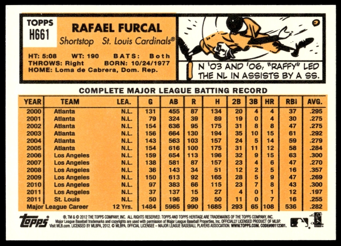This Baseball card, from 2012 is part of the Topps Heritage High Number card set. Rafael Furcal is featured and has a card number of H661.