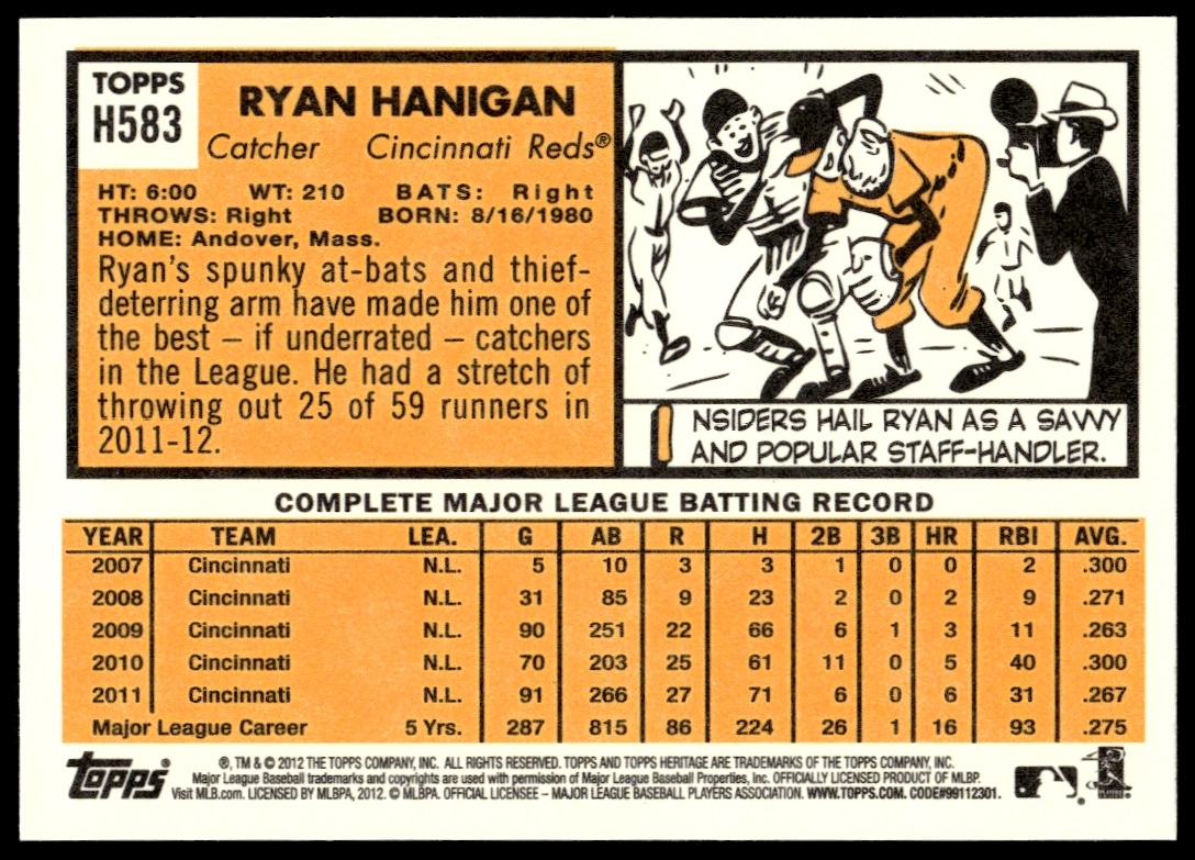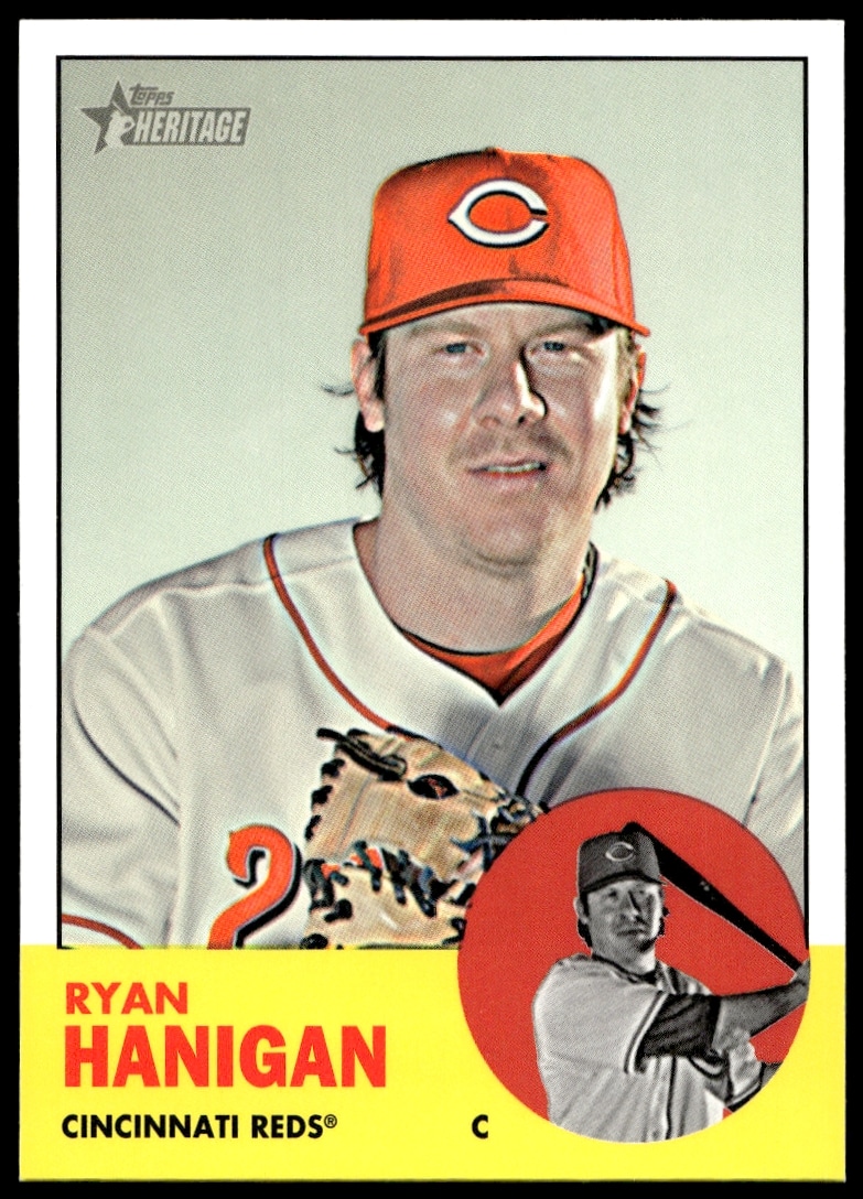 This BaseballΒ card, from 2012 is part of the Topps Heritage High NumberΒ card set. Ryan Hanigan is featured and has a card number of H583.