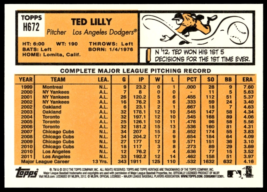This BaseballΒ card, from 2012 is part of the Topps Heritage High NumberΒ card set. Ted Lilly is featured and has a card number of H672.