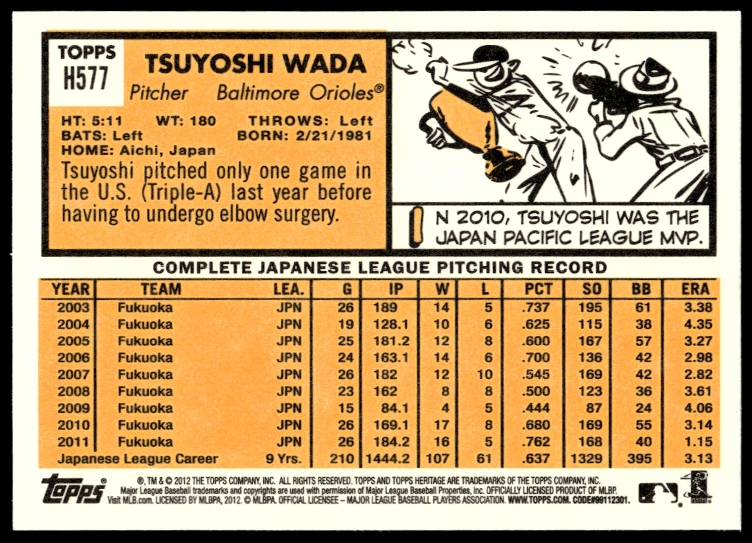 This BaseballΒ card, from 2012 is part of the Topps Heritage High NumberΒ card set. Tsuyoshi Wada is featured and has a card number of H577.