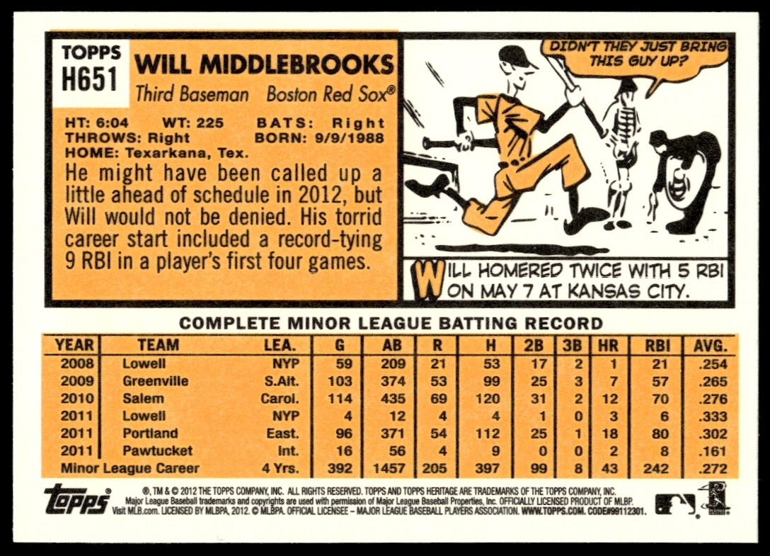 This BaseballΒ card, from 2012 is part of the Topps Heritage High NumberΒ card set. Will Middlebrooks is featured and has a card number of H651.