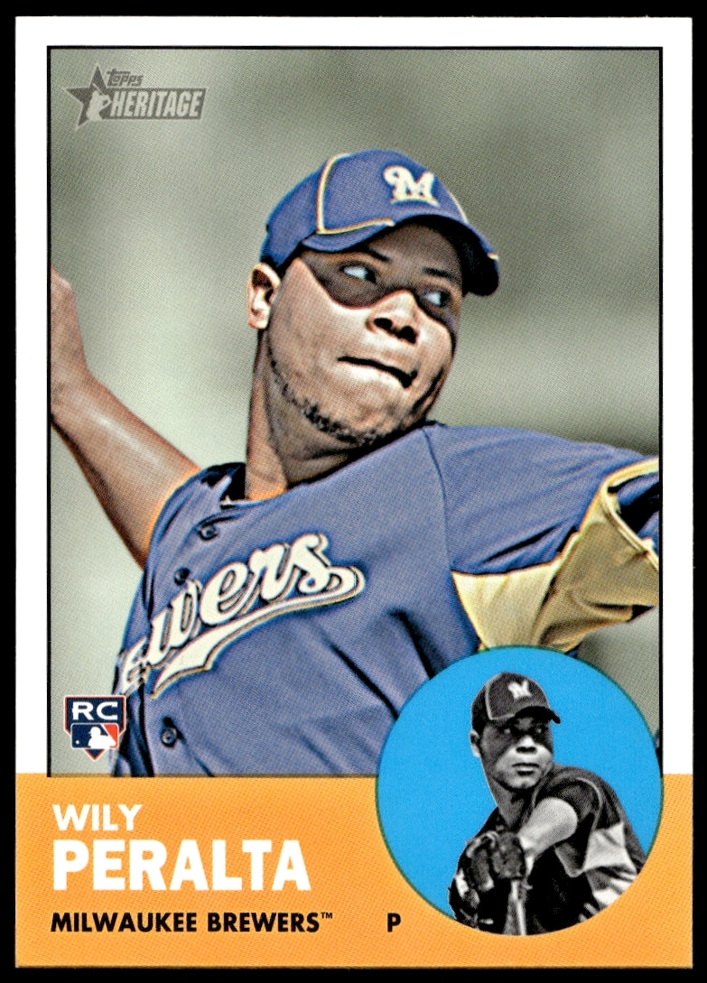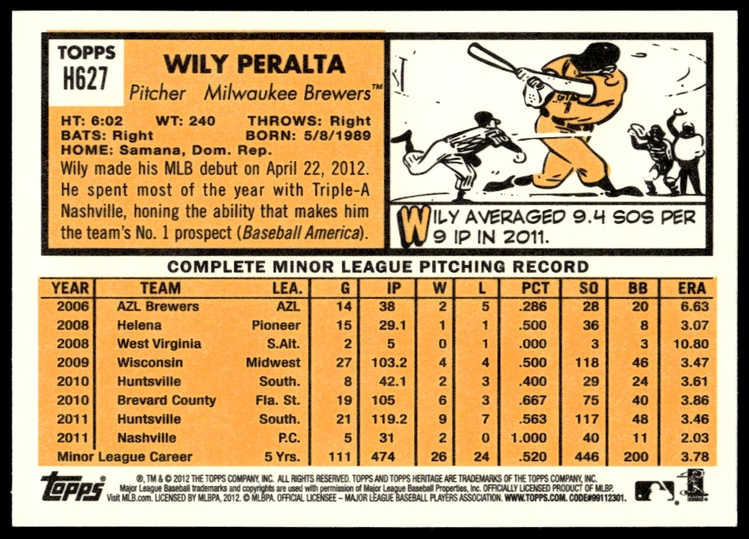 This BaseballΒ card, from 2012 is part of the Topps Heritage High NumberΒ card set. Wily Peralta is featured and has a card number of H627.
