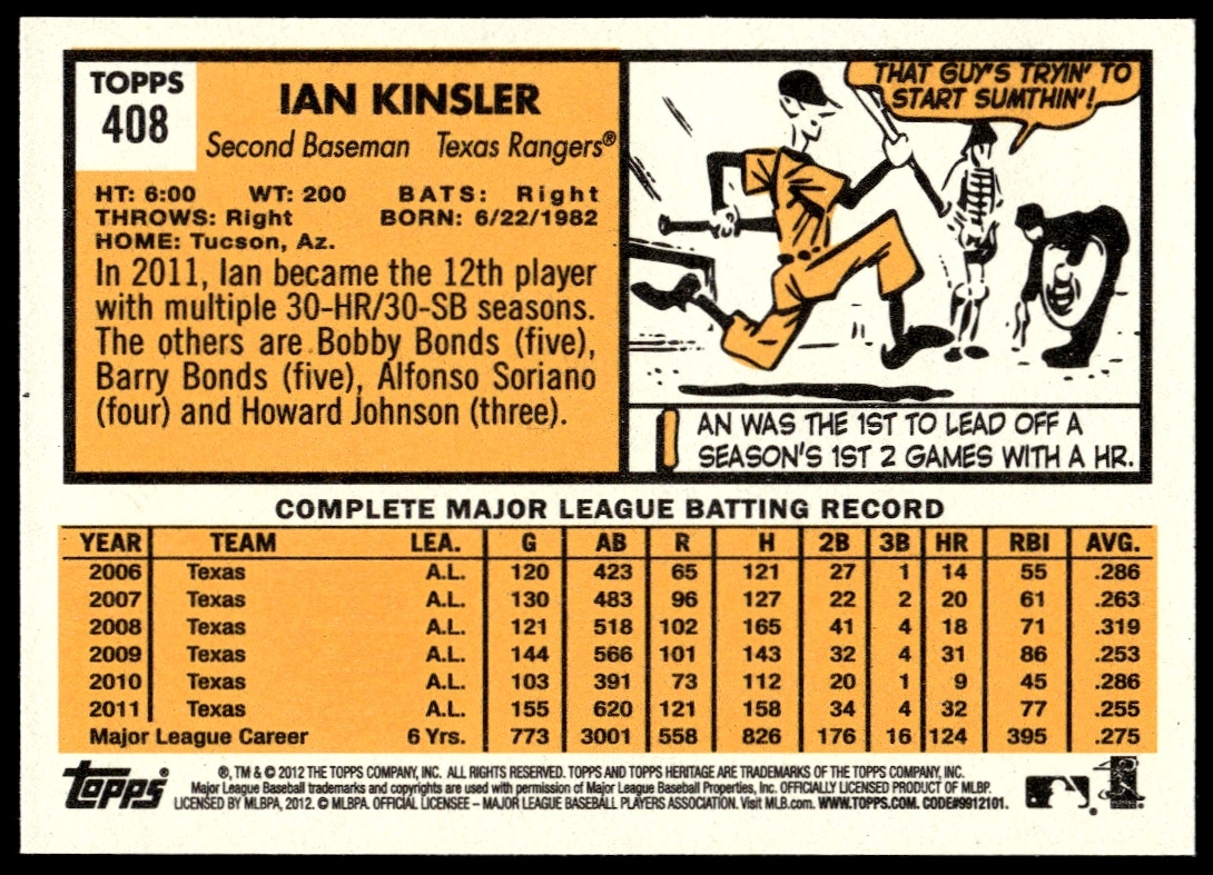 This Baseball card, from 2012 is part of the Topps Heritage card set. Ian Kinsler is featured and has a card number of 408.