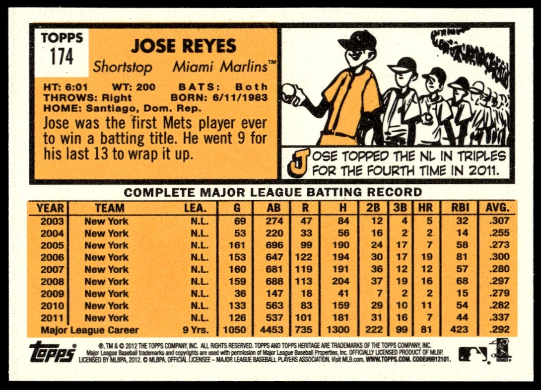 This Baseball card, from 2012 is part of the Topps Heritage card set. Jose Reyes is featured and has a card number of 174.