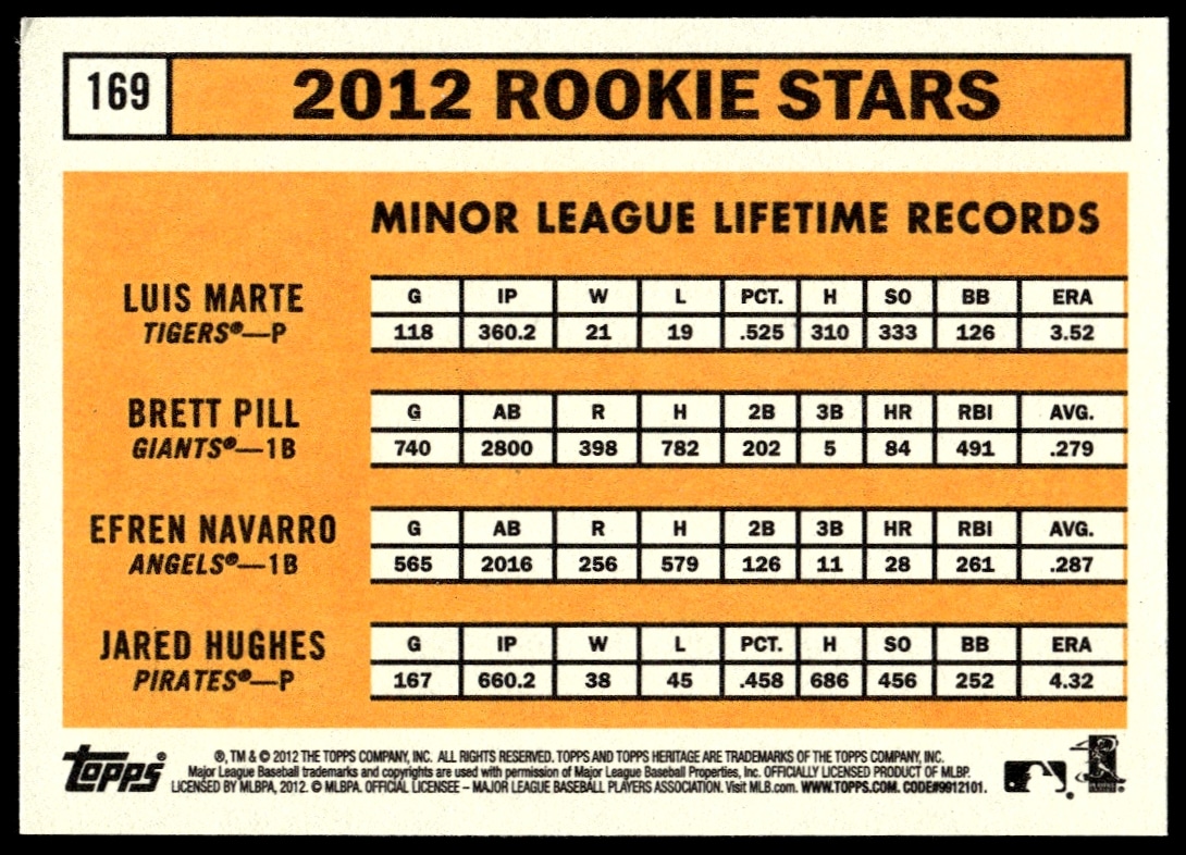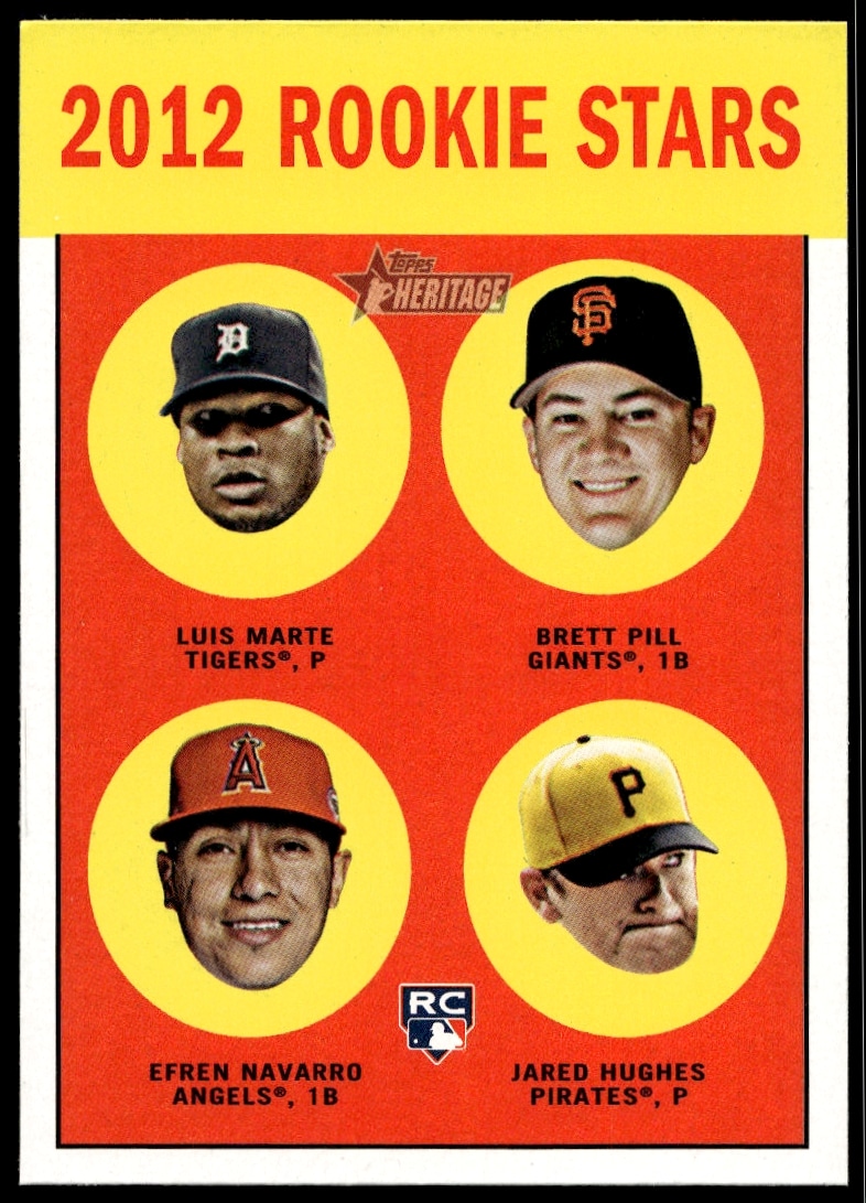 This BaseballΒ card, from 2012 is part of the Topps HeritageΒ card set. Luis Marte / Brett Pill / Efren Navarro / Jared Hughes is featured and has a card number of 169.