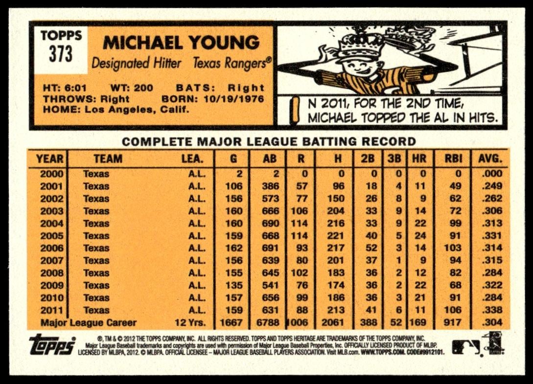 This Baseball card, from 2012 is part of the Topps Heritage card set. Michael Young is featured and has a card number of 373.