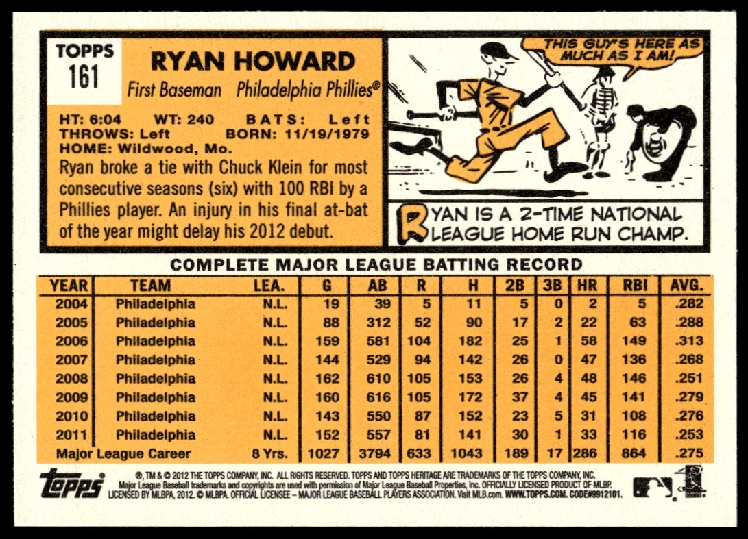 This BaseballΒ card, from 2012 is part of the Topps HeritageΒ card set. Ryan Howard is featured and has a card number of 161.