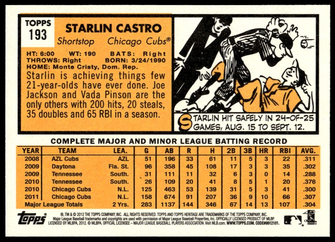 This BaseballΒ card, from 2012 is part of the Topps HeritageΒ card set. Starlin Castro is featured and has a card number of 193.