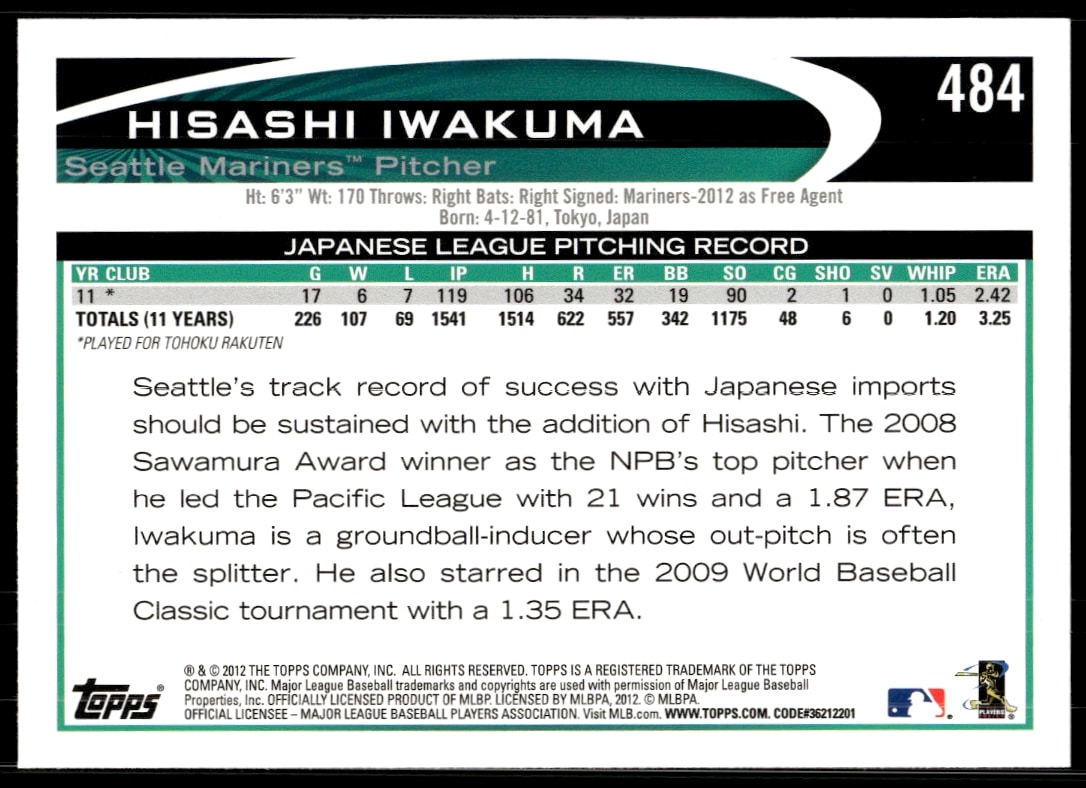 This Baseball card, from 2012 is part of the Topps card set. Hisashi Iwakuma is featured and has a card number of 484.