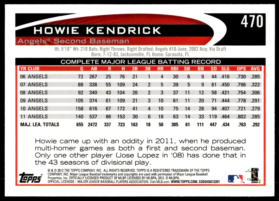 This Baseball card, from 2012 is part of the Topps card set. Howie Kendrick is featured and has a card number of 470.