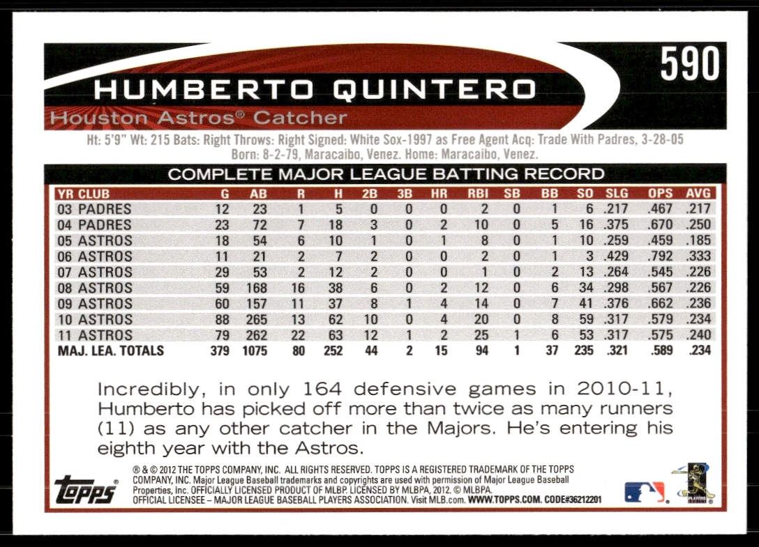 This Baseball card, from 2012 is part of the Topps card set. Humberto Quintero is featured and has a card number of 590.