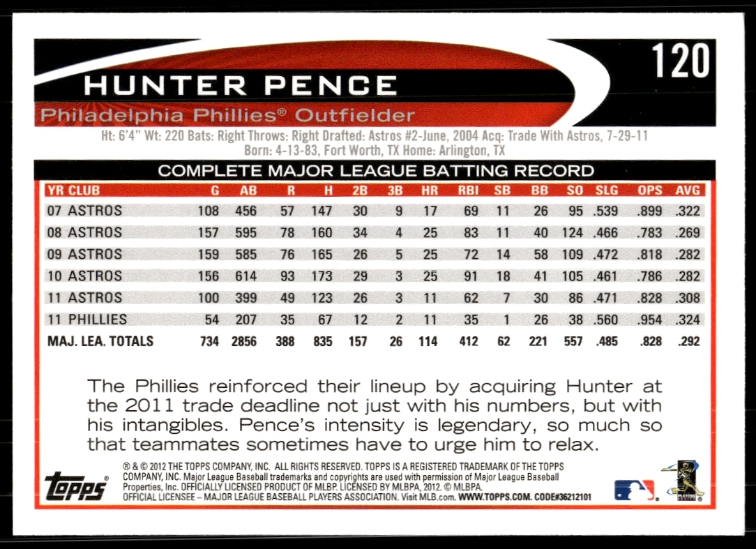 This Baseball card, from 2012 is part of the Topps card set. Hunter Pence is featured and has a card number of 120.
