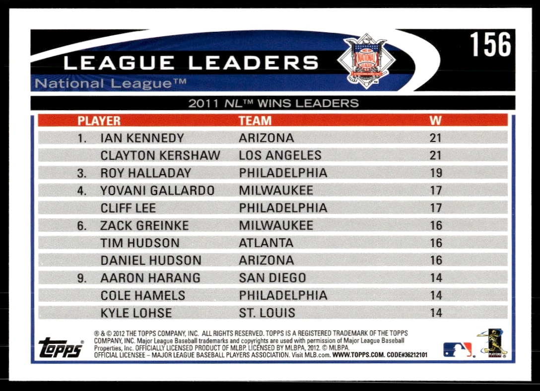 This Baseball card, from 2012 is part of the Topps card set. Ian Kennedy / Clayton Kershaw / Roy Halladay is featured and has a card number of 156.