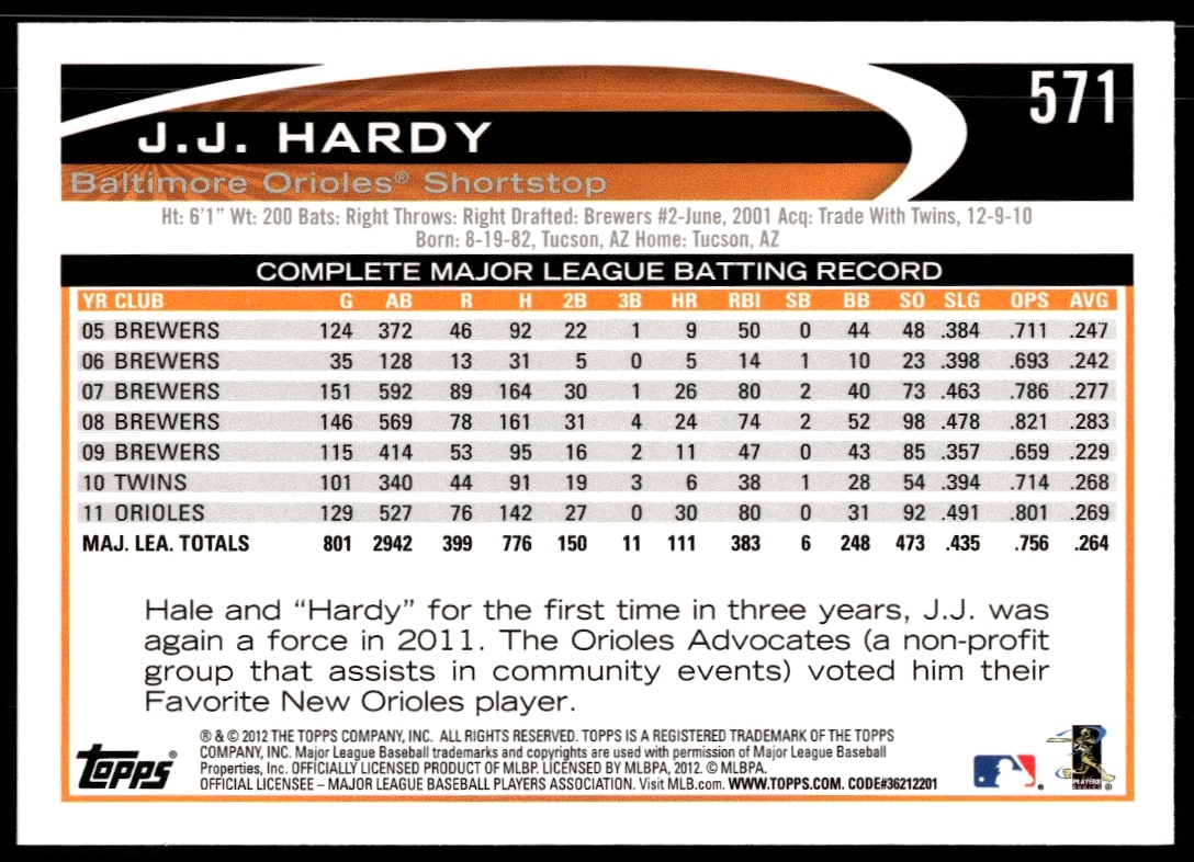 This Baseball card, from 2012 is part of the Topps card set. J.J. Hardy is featured and has a card number of 571.