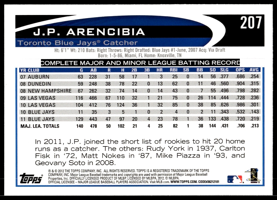 This Baseball card, from 2012 is part of the Topps card set. J.P. Arencibia is featured and has a card number of 207.