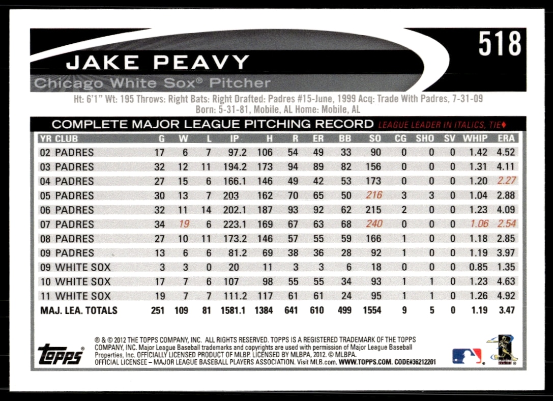 This Baseball card, from 2012 is part of the Topps card set. Jake Peavy is featured and has a card number of 518.