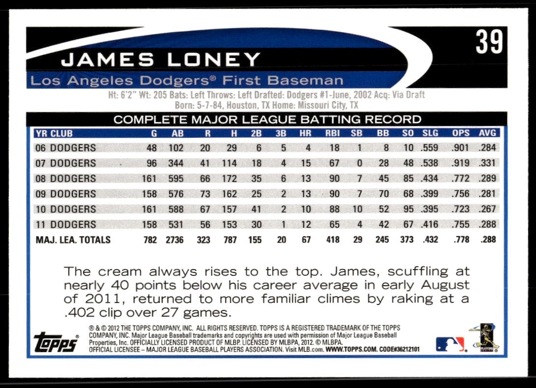 This Baseball card, from 2012 is part of the Topps card set. James Loney is featured and has a card number of 39.